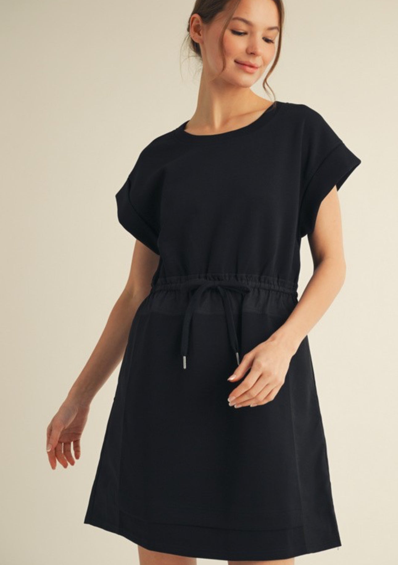 Jersey dress with U-neck, drawstring waistline, side pockets, short kimono sleeves, and stitch seams edge.